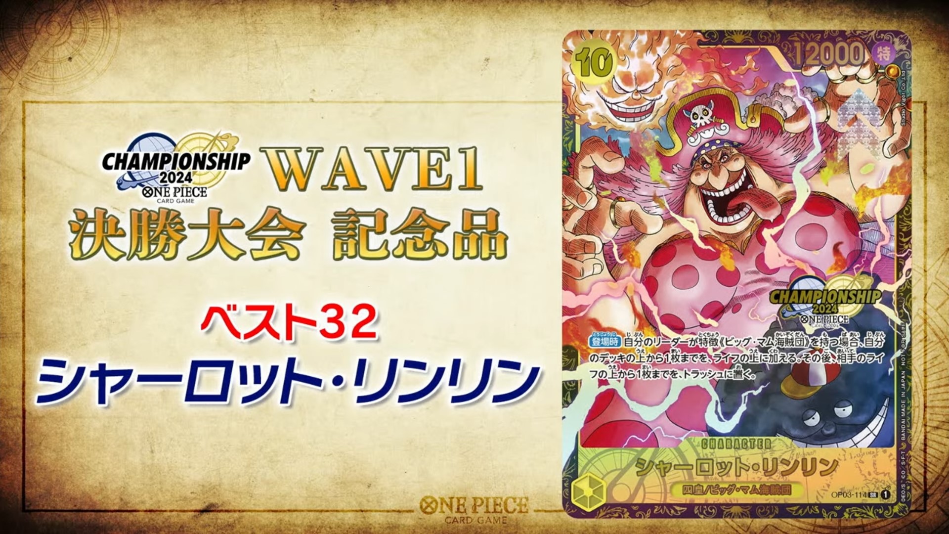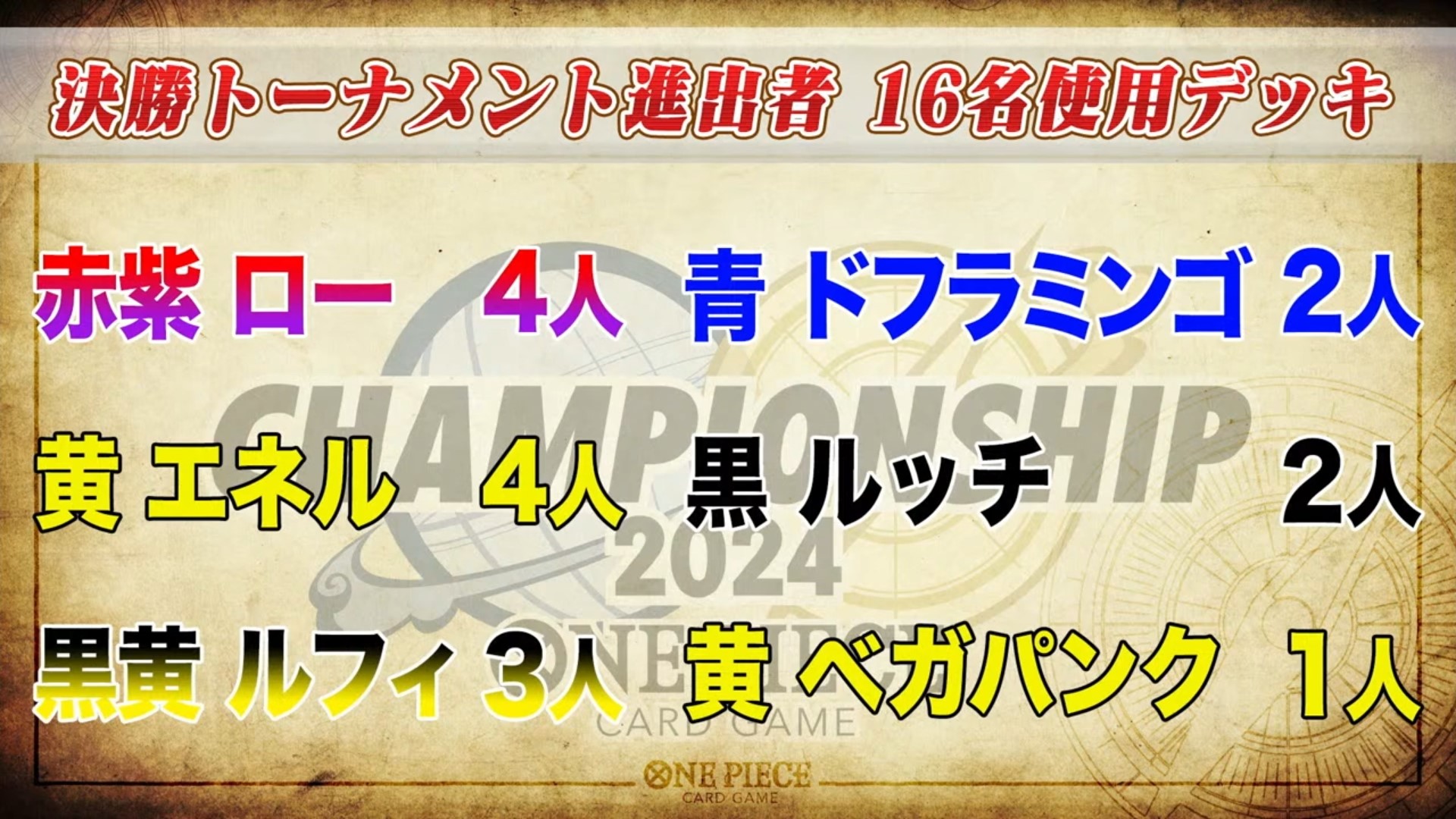 チャンピオンシップ2024とは、2024年4月~2024年3月の間でONE PIECEカードゲームの頂点を決める大会です。 全国各地で予選が行われ、そこで勝ち上がったプレイヤーたちが一堂に会して優勝を目指します。