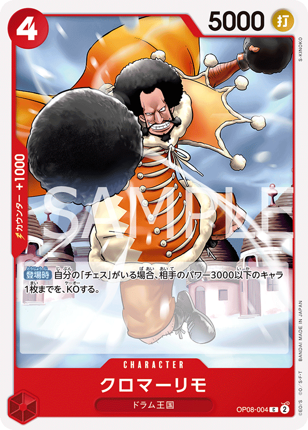 | 【相手のターン中】自分の特徴《ドラム王国》を持つキャラすべてを、パワー+1000。 | ||||||