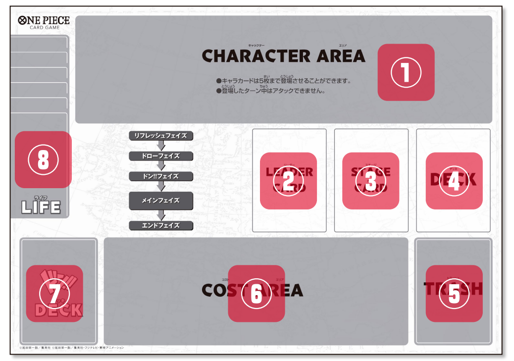 このプレイシートの⑥がコストエリアに当たる場所で、ここにドン‼カードを並べていきます。