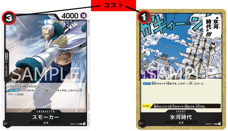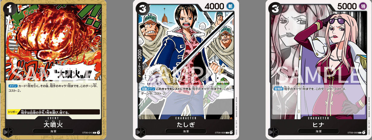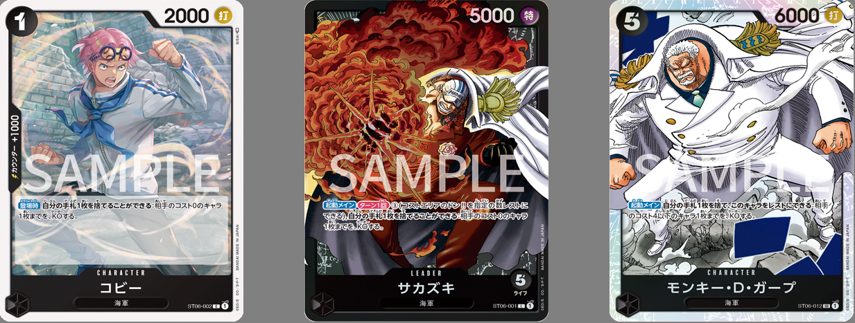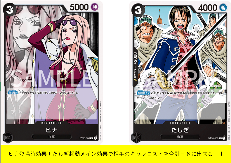 海軍デッキの特徴として、「コスト~以下のキャラをKO出来る」などを活かすために、海軍デッキにはコストマイナス(相手のコストを下げる)キャラがたくさん存在します。