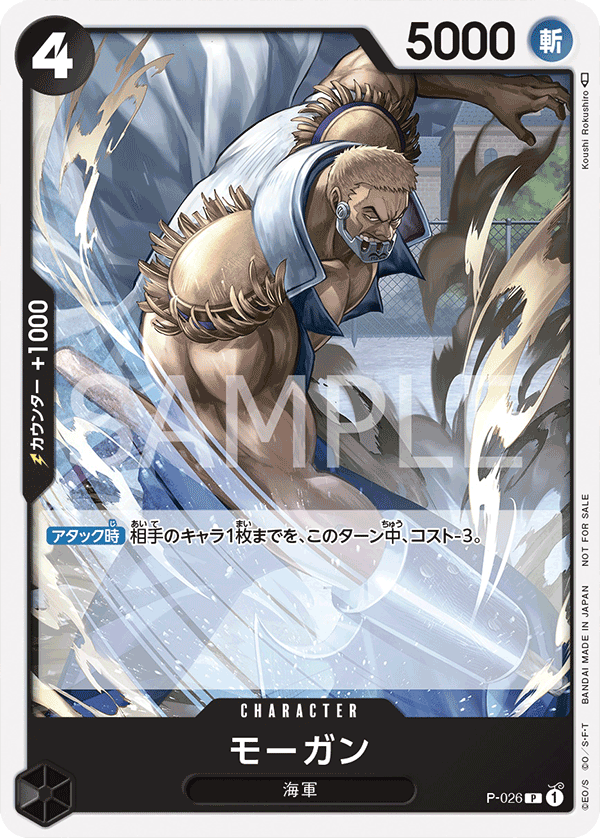 効果:【登場時】カード1枚を引く。 【アタック時】相手のキャラ1枚までを、このターン中、コスト-4。