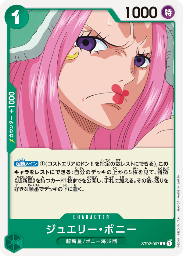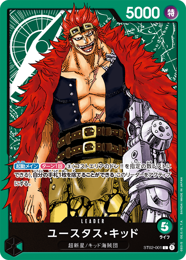 2コスト使用して(ドン‼カードを2枚レストにして)自分のキャラが5枚いる時に使用できます。自分のキャラ1枚を手札に戻して、戻したキャラと異なる色のコスト5以下のキャラ1枚までを登場させる。このカードはリーダーカードなので、赤と緑のカードをデッキに組み込めます。なので、赤のカードをデッキに戻した時は緑のカードを、といったような使い方になります。