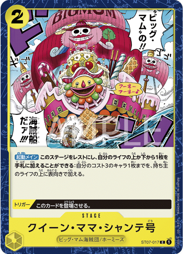 効果:【起動メイン】このステージをレストにできる:自分のリーダーが特徴《百獣海賊団》を持つ場合、ドン!!デッキからドン!!1枚までをレストで追加する。