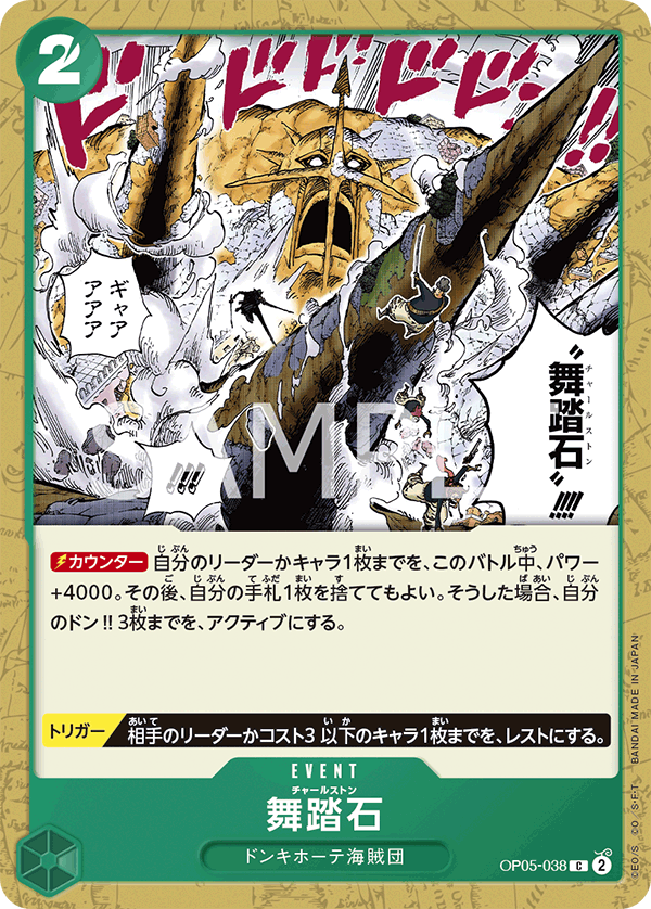 | 【カウンター】自分の特徴《スリラーバーク海賊団》を持つ、リーダーかキャラ1枚までを、このバトル中、パワー+3000。 | ||||||