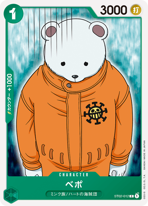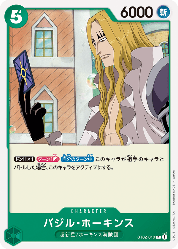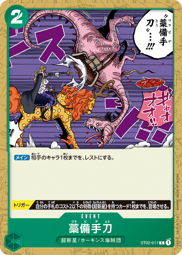 | 【登場時】自分のレストのコスト5以下の特徴《超新星》か《ハートの海賊団》を持つキャラ1枚までを、アクティブにする。 | ||||||