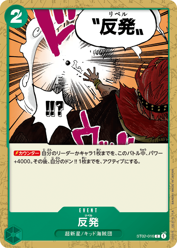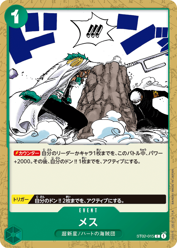 | 【カウンター】自分のリーダーかキャラ1枚までを、このバトル中、パワー+2000。その後、自分のドン!!1枚までを、アクティブにする。 | ||||||